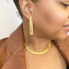 Product Description: Chevron like pattern Necklace set that includes matching drop earrings. The simplicity of this piece makes it easy to pair with blazers, blouses with a collar, tube and tank tops, solid color tshirts and much more. It’s also a great piece to layer with other necklaces shorter or longer in length.